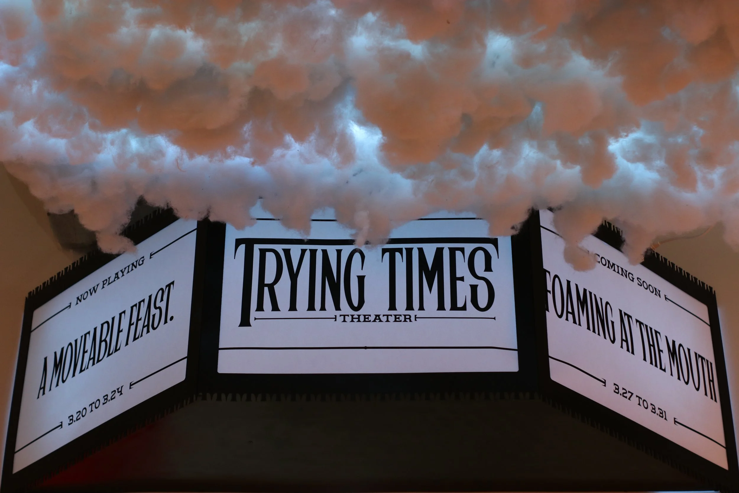 Trying Times Theater is a Post-Covid take on the Golden Age Cinemas. It realizes it’s mortality as a business after Covid and uses those tropes as marketing.